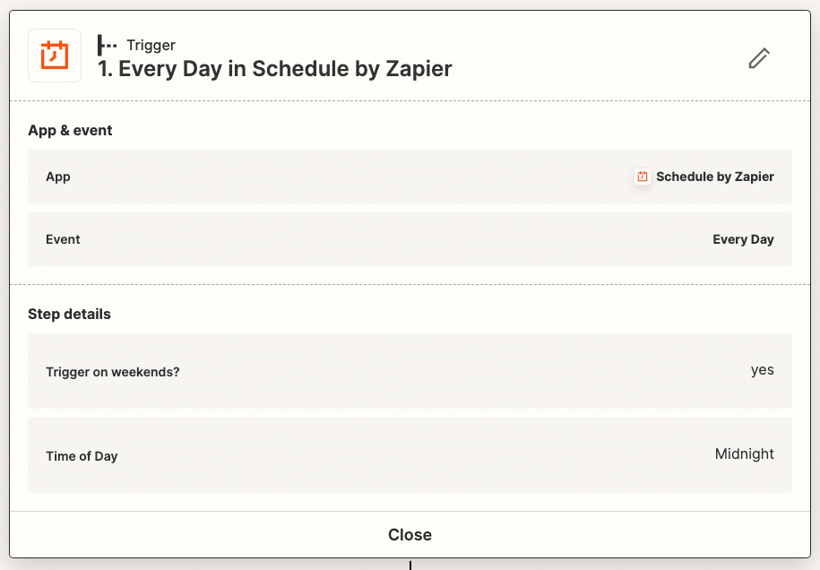 The “Trigger” of the Zap should be a “Schedule”, which will automatically run periodically. You can choose to run every hour or every day depending on how often your on-call schedule changes.