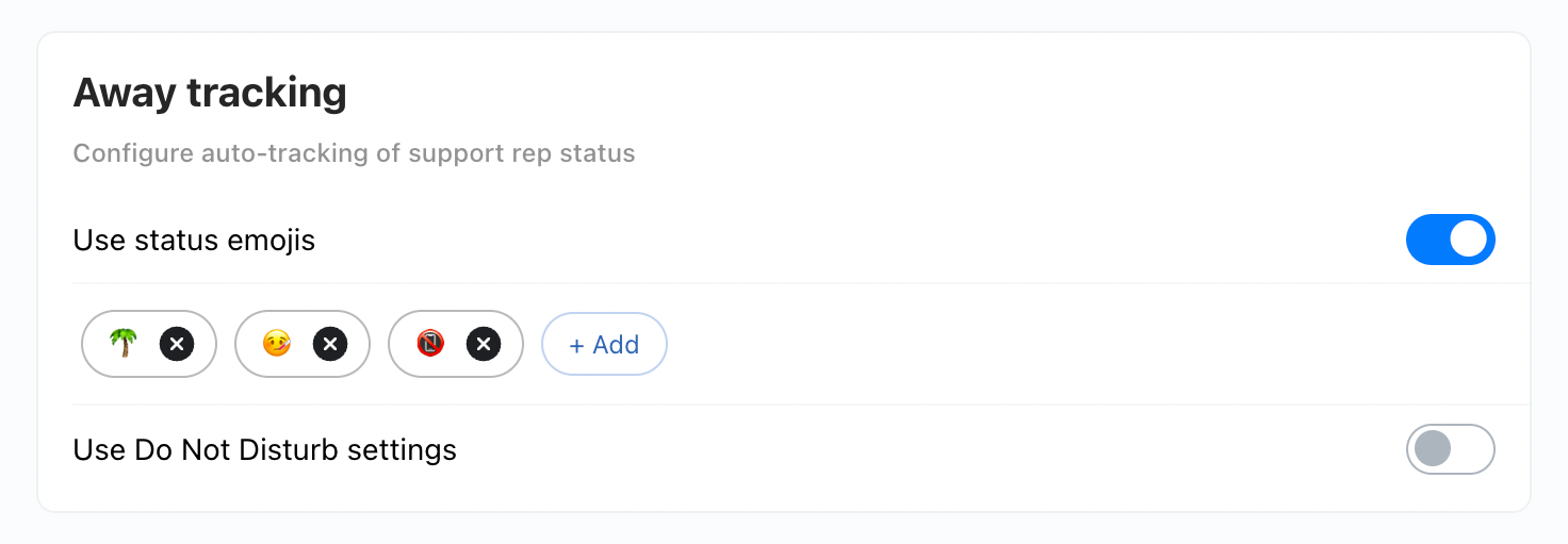 If you’re a company admin, you can navigate to the “Settings” > “Slack” page, and set up certain emojis to indicate when someone is away. If your team leverages tools like Clockwise or another calendar management tool with Slack support, we recommend adding the same emojis here so that your statuses sync to Unthread. You can also read a user’s “Do Not Disturb” setting, and choose to set them away if this setting is enabled.