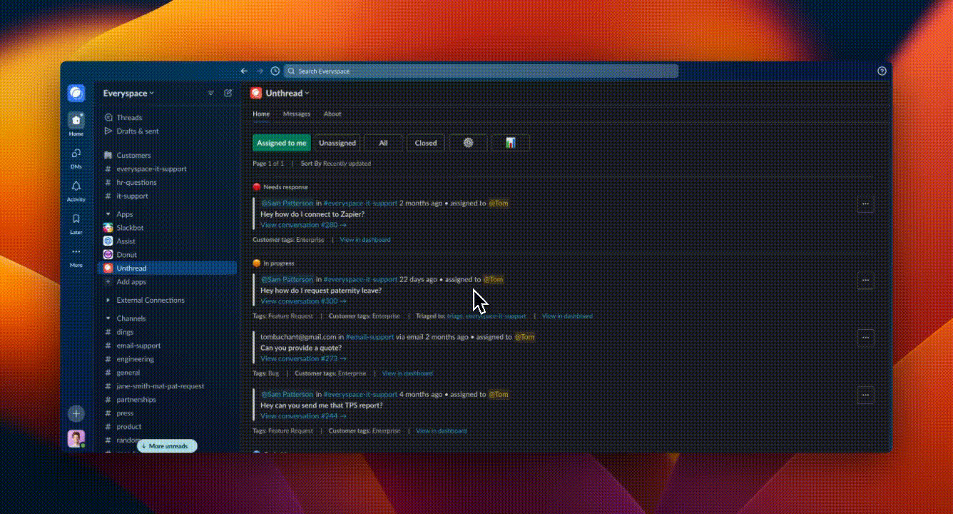 - Sync tags, assignees, and statuses from the Unthread app to your Zendesk ticketing platform