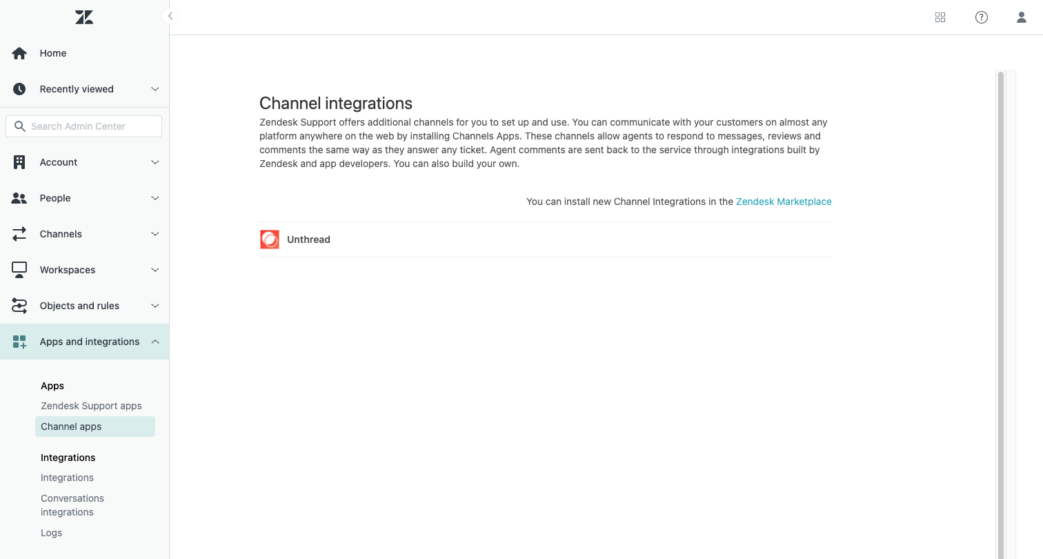 - Next, visit “Apps and integrations” -> “Channel apps” and click on the Unthread app.