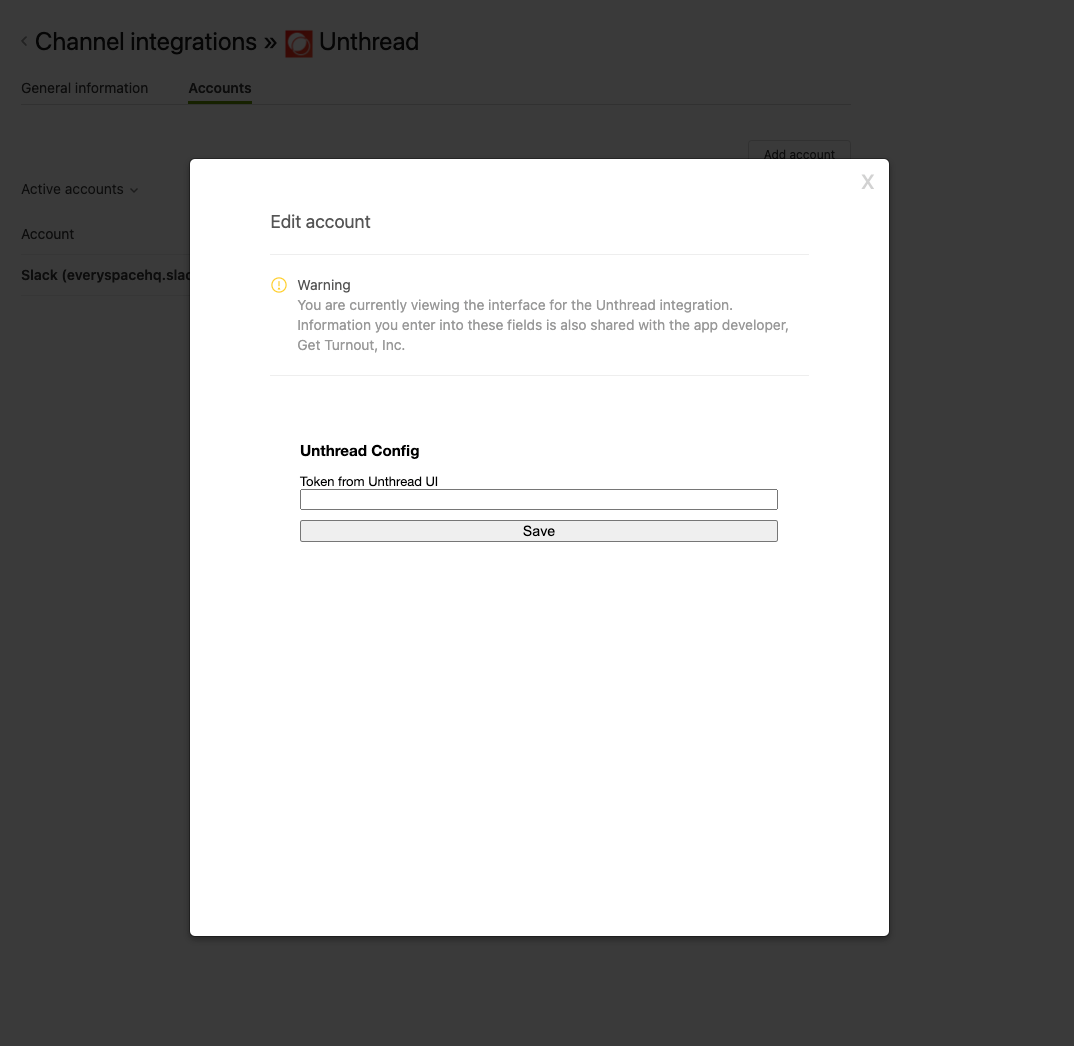 - This will display a popup asking for a token. Enter the secret token that you copied from the Unthread UI earlier and hit “Save”.