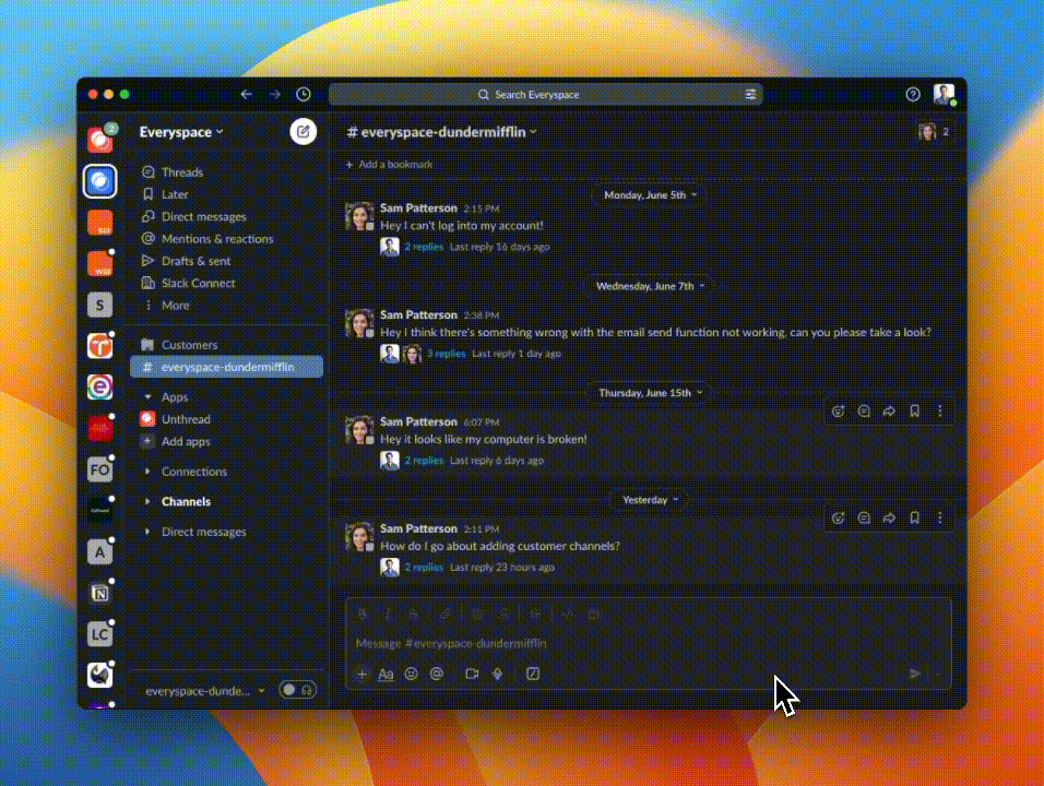Assigning conversations is a great way to set accountability within your team. When you assign a message to someone, it will be in their Unthread inbox, and they’ll get a DM when they are assigned a new message.