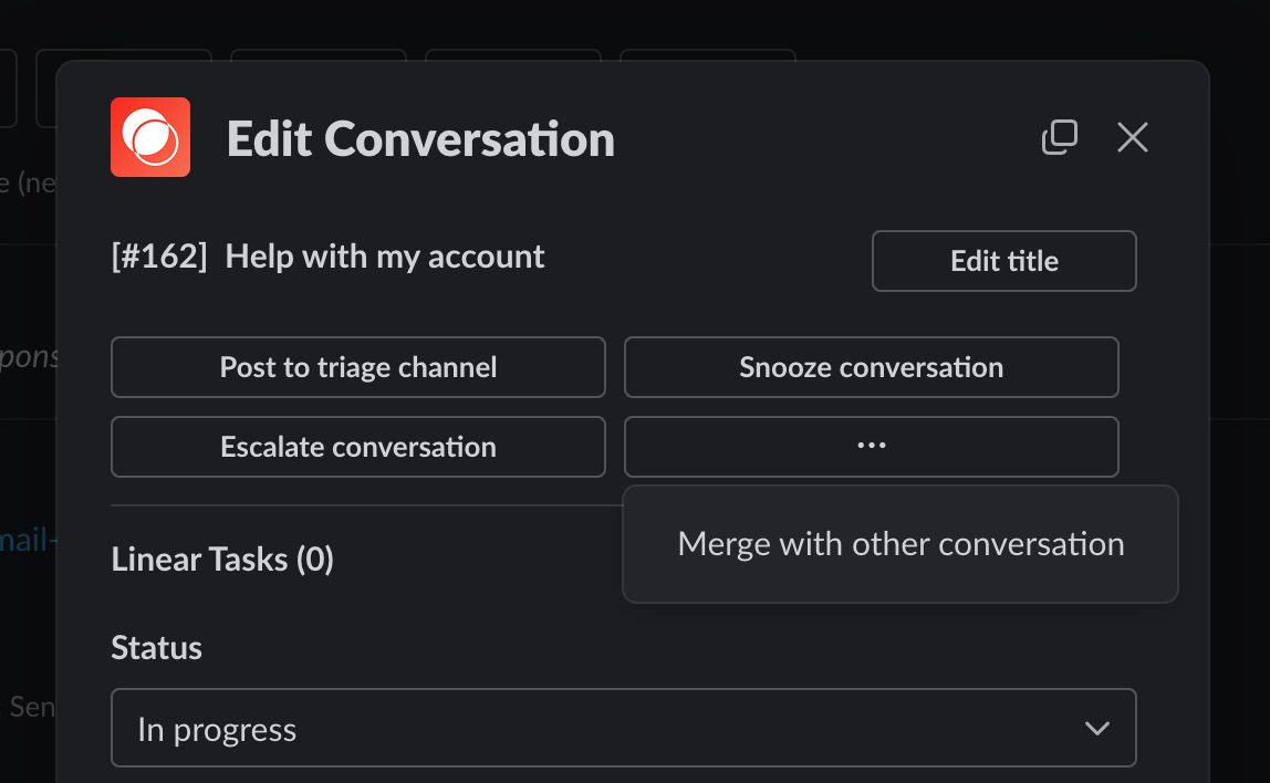 The Unthread app for Slack has the ability to manage conversation details from a pop-up. If you see a button labeled “Manage conversation”, it will pop up an edit modal with action and edit options.