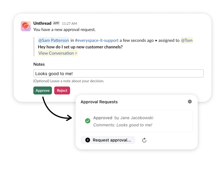 When collaborating on tickets, you may need to get an approval from a team member. Approval Requests will automatically DM that person with an easy way to give approval, leave comments, or make a note about why the request was rejected.