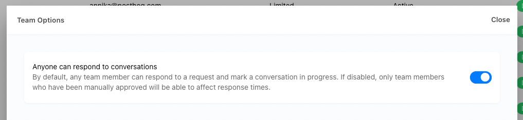 By default, all team members are eligible to respond to customer conversations, but you can also manage the default by clicking the “Options” button in the team tab.